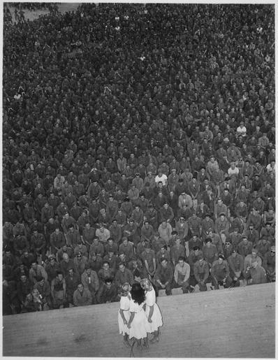 | Keywords: A portion of the 10,000 GI's who were on hand to witness the showing of the Copacabana All Girl Review, listen... - NARA - 531313.tif Scope and content General notes Use War and Conflict Number 905 when ordering a reproduction or requesting information about this image 531313 Local identifier 111-SC-210796 Department of Defense Department of the Army Office of the Chief Signal Officer 09/18/1947 - 02/28/1964 Still Picture Records Section Special Media Archives Services Division NWCS-S National Archives at College Park 8601 Adelphi Road College Park MD 20740-6001 1945-08-29 Record group Record Group 111 Records of the Office of the Chief Signal Officer 1860 - 1985 Record group ARC 440 Signal Corps Photographs of American Military Activity compiled 1754 - 1954 Series ARC 530707 File unit File unit ARC Variant control numbers NAIL Control Number NWDNS-111-SC-210796 yes Other versions NARA-cooperation PD-USGov Female vocalists Live music in France 1945 in France Black and white photographs of concerts Music audiences |