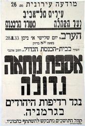 Keywords: A poster calling to protest against the persecution of Jews in Germany, Tel Aviv 1933.jpg he מודעה מה-28 במרץ 1933 - כנגד רדיפות היהודי בגרמניה - יוצרה בת אביב מרץ 1933 עיריית ת אביב http //tel-aviv millenium org il/ D7 9C D7 95 D7 97+ D7 9E D7 95 D7 93 D7 A2 D7 95 D7 AA/ author PD-old Custom license marker 1933 03 28 PD-Israel Uploaded with UploadWizard The Holocaust |
