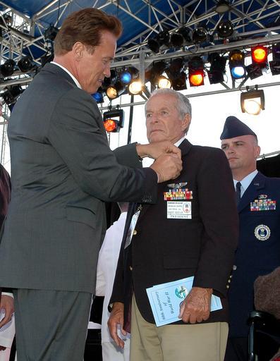 Keywords: A Schwarzenegger awards at a WWII 60th anniversary ceremony 2005.jpg en San Diego Calif May 29 2005 - California Gov Arnold Schwarzenegger awards a Rupture Duck to Army Air Corps Veteran Harry Kaplan at a WWII 60th anniversary ceremony The Rupture Duck was given to service members honorably discharged from the service during WWII The ceremony was organized by the Department of Defense World War II 60th Anniversary Commemoration Committee to pay tribute and recognize World War II veterans for their outstanding service and sacrifice during the Memorial Day weekend http //www navy mil/view_image asp id 24845 2005-05-29 U S Navy photo by Photographer's Mate 1st Class Michael Moriatis PD-USGov-Military-Navy Arnold Schwarzenegger in 2005 20050529 |