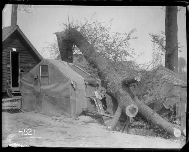 | Keywords: blackandwhite monochrome photo border outdoor black and white A tall tree shelled by German artillery collapsed onto a New Zealand army hut near the Western Front during World War I. Athough much of the hut was destroyed no lives were lost. Photograph taken probably France 12 August 1917 by Henry Armytage Sanders. Inscriptions: Inscribed - Photographer's title on negative -bottom left: H821. Quantity: 1 b&w original negative(s). Physical Description: Dry plate glass negative 4 x 5 inches A shelled tree collapsed on the soldiers' hut, World War I. Royal New Zealand Returned and Services' Association :New Zealand official negatives, World War 1914-1918. Ref: 1/2-013405-G. Alexander Turnbull Library, Wellington, New Zealand. natlib.govt.nz/records/23007978 A tall tree shelled by German artillery collapsed onto a New Zealand army hut near the Western Front during World War I. Athough much of the hut was destroyed no lives were lost. Photograph taken probably France 12 August 1917 by Henry Armytage Sanders. Inscriptions: Inscribed - Photographer's title on negative -bottom left: H821. Quantity: 1 b&w original negative(s). Physical Description: Dry plate glass negative 4 x 5 inches A shelled tree collapsed on the soldiers' hut, World War I. Royal New Zealand Returned and Services' Association :New Zealand official negatives, World War 1914-1918. Ref: 1/2-013405-G. Alexander Turnbull Library, Wellington, New Zealand. natlib.govt.nz/records/23007978 |