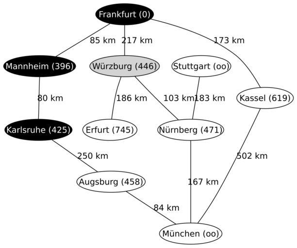| Keywords: A-Star4.svg Dritter Schritt Karlsruhe wurde erkundet als nächstes wird Würzburg untersucht Fourth step of a run of the A search Algorithm on a map of Germany Created by Regnaron with graphviz A search algorithm 2005-11-06 own assumed Regnaron~commonswiki |