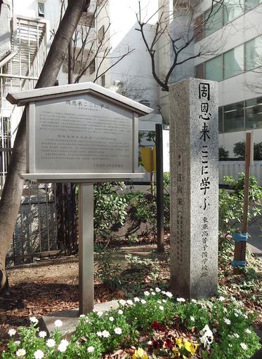 | Keywords: A stone monument Zhou Enlai once learned here the site of East Asian Higher Preparatory School Jimbocho Aizen Park Chiyoda-ku Tokyo Japan.jpg ja 石碑 周恩 ここに学ぶ -- 高等予備学校跡-- 京都千代田区神 町愛全公 zh-cn 石碑 周恩 曾 此求学 -- 亚高等予备学校遗迹-- 京都千代田区神 町爱全公园 en A stone monument Zhou Enlai once learned here at the site of East Asian Higher Preparatory School Jimbocho Aizen Park Chiyoda-ku Tokyo Japan 2016-03-05 own ウィキ太郎 Wiki Taro other versions 35 41 49 3 N 139 45 23 2 E region JP cc-zero Chiyoda Tokyo Zhou Enlai Stone monuments and memorials |