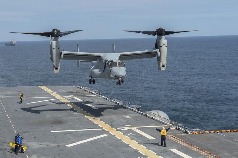 Keywords: A U.S. Marine Corps MV-22 Osprey tiltrotor aircraft attached to Marine Operational Test and Evaluation Squadron (VMX) 22 prepares to land on the amphibious assault ship USS America (LHA 6) in the Pacific Ocean 140827-N-MD297-063.jpg en A U S Marine Corps MV-22 Osprey tiltrotor aircraft attached to Marine Operational Test and Evaluation Squadron VMX 22 prepares to land on the amphibious assault ship USS America LHA 6 in the Pacific Ocean Aug 27 2014 The America embarked on a mission to conduct training engagements with partner nations throughout the Americas before reporting to its new home port of San Diego The America was set to be ceremoniously commissioned Oct 11 2014 2014-08-27 MC3 Huey D Younger Jr http //www defenseimagery mil/imageRetrieve action guid f86061d219d03f0c8a668745498281fdbb8941d2 t 2 Public domain photograph from defenseimagery mil http //www defenseimagery mil/imagery html guid f86061d219d03f0c8a668745498281fdbb8941d2 140827-N-MD297-063 2014-08-29 USS America LHA 6 PD-USGov-Military-Navy MV-22B Osprey Aboard USS America LHA-6 Images from DoD uploaded by Fæ