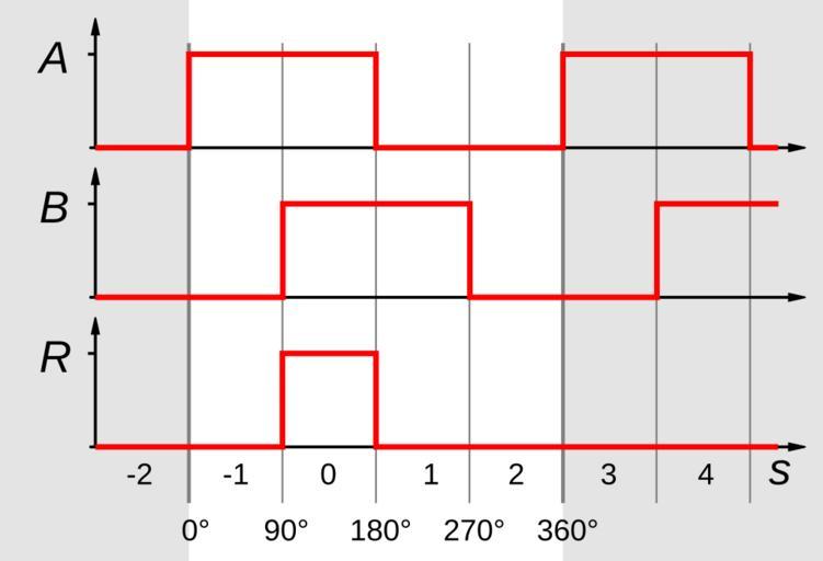 | Keywords: AB Signal and Ref.svg 2 electrically by 90° phase-shifted square-wave pulses A B as output of en Rotary encoder and a Reference pulse R Below is the count at 4-fold evaluation 2 um 90° elektrisch phasenversetzte Rechteckimpulse A B wie sie de Inkrementalgeber ausgeben und ein Refernzimpuls R Darunter steht der Zählerstand bei 4-fach Auswertung own MatthiasDD 2012-04-14 Square waves Cc-zero | ||||