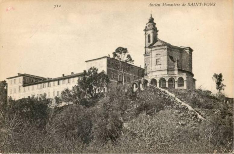 Keywords: Abbaye Saint-Pons 1900.jpg fr abbaye Saint-Pons à Nice Alpes-Maritimes France vers 1900 carte postale Jean-Baptiste Giletta 1856-1933 circa 1900 l'absence des bâtiments de l'hôpital Pasteur en contre-bas de l'abbaye prouve que la photographie a été réalisée avant 1910 date du début de la construction de cet hôpital PD-old Abbaye de Saint Pons Jean Gilletta |