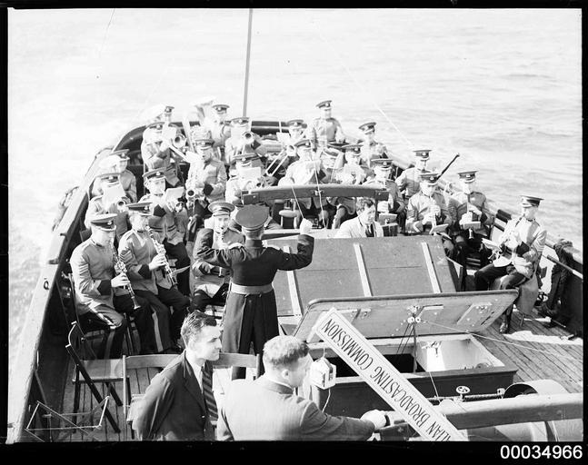 | Keywords: hood collection hoodcollection samuel j hood collection samueljhoodcollection hood royal australian navy royalaustraliannavy navy naval vessel navalvessel sydney hmas australia hmasaustralia flagship hmas canberra hmascanberra abc australian broadcasting commission australianbroadcastingcommission military band militaryband abc military band abcmilitaryband national military band nationalmilitaryband microphone awa reiss awareiss sydney harbour sydneyharbour sydney heads sydneyheads stanley ash stanleyash stan ash stanash blackandwhite monochrome photo border black and white This photograph probably depicts the Australian Broadcasting Commission 22-piece Military Band (also known as the National Military Band) with a conductor performing on board a small vessel with an Australian Broadcasting Commission commentator. The microphone depicted in the foreground underneath the sign is an AWA Reiss microphone, which were used in the 1920s and early 1930s for outdoor broadcasts. This photo is part of the Australian National Maritime Museum’s Samuel J. Hood Studio collection. Sam Hood (1872-1953) was a Sydney photographer with a passion for ships. His 60-year career spanned the romantic age of sail and two world wars. The photos in the collection were taken mainly in Sydney and Newcastle during the first half of the 20th century. The ANMM undertakes research and accepts public comments that enhance the information we hold about images in our collection. This record has been updated accordingly. Photographer: Samuel J. Hood Studio Collection Object no. 00034966 This photograph probably depicts the Australian Broadcasting Commission 22-piece Military Band (also known as the National Military Band) with a conductor performing on board a small vessel with an Australian Broadcasting Commission commentator. The microphone depicted in the foreground underneath the sign is an AWA Reiss microphone, which were used in the 1920s and early 1930s for outdoor broadcasts. This photo is part of the Australian National Maritime Museum’s Samuel J. Hood Studio collection. Sam Hood (1872-1953) was a Sydney photographer with a passion for ships. His 60-year career spanned the romantic age of sail and two world wars. The photos in the collection were taken mainly in Sydney and Newcastle during the first half of the 20th century. The ANMM undertakes research and accepts public comments that enhance the information we hold about images in our collection. This record has been updated accordingly. Photographer: Samuel J. Hood Studio Collection Object no. 00034966 |