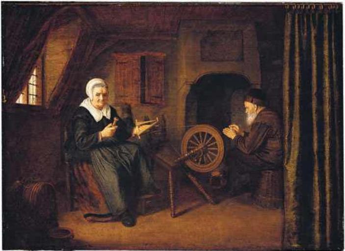 Keywords: Abraham de Pape 001.jpg NG1221 Bought 1886 Signed and dated on the wall-cupboard A DE PAPE 165 8 or 9 Tobit and Anna were the parents of Tobias who saved his father's sight with the help of the Archangel Raphael Tobit had been reduced to poverty by God as a test Anna supported them with her spinning wheel Book of Tobit 2 11 and 4 21 If the identification of the subject as Tobit and Anna is correct the spinning-wheel is presumably a reference to Anna working for money and the bare cupboard an allusion to their poverty Because of the interior setting the painting was for a long time been interpreted as being a genre scene with an old couple However the subject was identified by comparison with a similar painting by Rembrandt 'Anna and the Blind Tobit' also in the National Gallery's Collection In 17th-century Holland paintings were sometimes protected by curtains and illusionistic representations of them as in the curtain set in front of the scene on the right are not uncommon Oil on oak 40 7 × 56 cm http //www nationalgallery org uk/cgi-bin/WebObjects dll/CollectionPublisher woa/wa/work workNumber ng1221 ca 1658 Creator Abraham de Pape Museum National Gallery London PD-old-100 Abraham de Pape 1658 Paintings of Tobit 1650s paintings in the United Kingdom Dutch Golden Age paintings in the National Gallery London Pape Abraham de 1658 circa 17th-century domestic activities in painting 17th-century religious paintings in the United Kingdom 1658