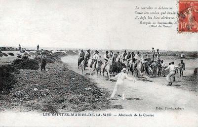 Keywords: Abrivade.jpg fr Abrivade arrivée des taureaux encadrés par des gardians à cheval en Camargue France own Christian Lassure Early 20th century / Début du XXe siècle Cc-zero Camargue cattle Postcards of Saintes-Maries-de-la-Mer Regional clothing in Camargue Abrivado Horse riding in France Camargue horse |