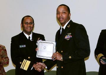 | Keywords: Academic award 090209-N-YT478-044.jpg en Officer Candidate Tyrell Grant receives the Distinguished Academic Award from Vice Adm Mel Williams Jr commander of U S 2nd Fleet during an awards ceremony in celebration of Black History Month Grant formerly an active-duty Electronics Technician 1st Class received the award for having a grade point average of 3 81 for the Fall 2008 semester U S Navy photo by Mass Communication Specialist 1st Class Lolita M Lewis/Released 2009-02-09 Petty Officer 1st Class Lolita Lewis https //www dvidshub net/image/1269709 090209-N-YT478-044 2014-04-24 08 05 NORFOLK VA US PD-USGov-Military-Navy Black History Month Images from DoD uploaded by Fæ |