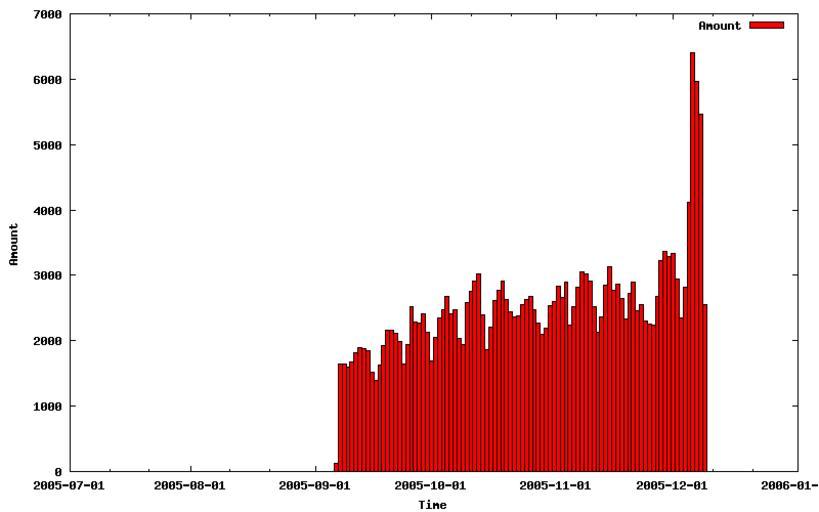Keywords: Account creations on the English Wikipedia.png Account creations on the English Wikipedia Gnuplot script <pre> /usr/bin/env gnuplot set style fill solid 1 000000 border -1 set terminal png transparent size 800 500 set output 'plot png' set xdata time set timefmt Y- m- d set format x Y- m- d set ylabel Amount set xlabel Time plot data using 1 2 with boxes title Amount </pre> data <pre> 2005-08-01 0 2005-08-02 0 2005-08-03 0 2005-08-04 0 2005-08-05 0 2005-08-06 0 2005-08-07 0 2005-08-08 0 2005-08-09 0 2005-08-10 0 2005-08-11 0 2005-08-12 0 2005-08-13 0 2005-08-14 0 2005-08-15 0 2005-08-16 0 2005-08-17 0 2005-08-18 0 2005-08-19 0 2005-08-20 0 2005-08-21 0 2005-08-22 0 2005-08-23 0 2005-08-24 0 2005-08-25 0 2005-08-26 0 2005-08-27 0 2005-08-28 0 2005-08-29 0 2005-08-30 0 2005-08-31 0 2005-09-01 0 2005-09-02 0 2005-09-03 0 2005-09-04 0 2005-09-05 0 2005-09-06 0 2005-09-07 127 2005-09-08 1649 2005-09-09 1644 2005-09-10 1591 2005-09-11 1674 2005-09-12 1818 2005-09-13 1896 2005-09-14 1880 2005-09-15 1842 2005-09-16 1514 2005-09-17 1391 2005-09-18 1631 2005-09-19 1925 2005-09-20 2157 2005-09-21 2161 2005-09-22 2121 2005-09-23 1982 2005-09-24 1647 2005-09-25 1935 2005-09-26 2525 2005-09-27 2283 2005-09-28 2271 2005-09-29 2416 2005-09-30 2132 2005-10-01 1692 2005-10-02 2047 2005-10-03 2356 2005-10-04 2476 2005-10-05 2676 2005-10-06 2414 2005-10-07 2469 2005-10-08 2028 2005-10-09 1940 2005-10-10 2582 2005-10-11 2753 2005-10-12 2917 2005-10-13 3025 2005-10-14 2397 2005-10-15 1868 2005-10-16 2210 2005-10-17 2623 2005-10-18 2768 2005-10-19 2906 2005-10-20 2629 2005-10-21 2436 2005-10-22 2365 2005-10-23 2381 2005-10-24 2557 2005-10-25 2630 2005-10-26 2680 2005-10-27 2467 2005-10-28 2268 2005-10-29 2098 2005-10-30 2198 2005-10-31 2533 2005-11-01 2602 2005-11-02 2834 2005-11-03 2658 2005-11-04 2899 2005-11-05 2245 2005-11-06 2519 2005-11-07 2820 2005-11-08 3047 2005-11-09 3026 2005-11-10 2905 2005-11-11 2516 2005-11-12 2131 2005-11-13 2361 2005-11-14 2845 2005-11-15 3134 2005-11-16 2770 2005-11-17 2867 2005-11-18 2649 2005-11-19 2336 2005-11-20 2719 2005-11-21 2900 2005-11-22 2456 2005-11-23 2558 2005-11-24 2297 2005-11-25 2252 2005-11-26 2233 2005-11-27 2671 2005-11-28 3229 2005-11-29 3361 2005-11-30 3293 2005-12-01 3329 2005-12-02 2939 2005-12-03 2349 2005-12-04 2826 2005-12-05 4125 2005-12-06 6412 2005-12-07 5967 2005-12-08 5461 2005-12-09 2548 2005-12-10 0 2005-12-11 0 2005-12-12 0 2005-12-13 0 2005-12-14 0 2005-12-15 0 2005-12-16 0 2005-12-17 0 2005-12-18 0 2005-12-19 0 2005-12-20 0 2005-12-21 0 2005-12-22 0 2005-12-23 0 2005-12-24 0 2005-12-25 0 2005-12-26 0 2005-12-27 0 2005-12-28 0 2005-12-29 0 2005-12-30 0 2005-12-31 0 </pre> English Wikipedia statistics |