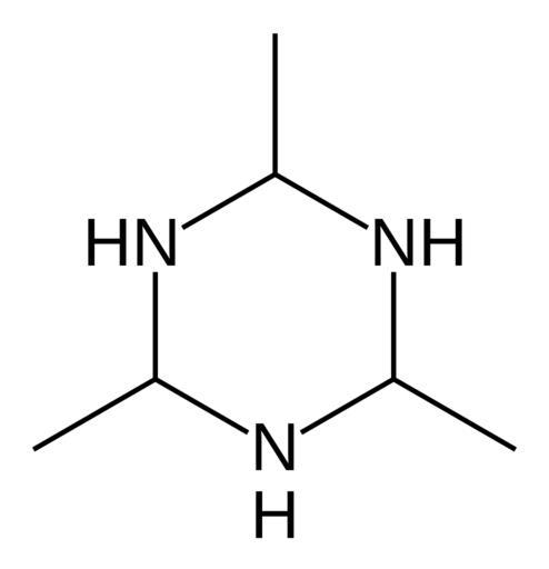 | Keywords: Acetaldehyde ammonia trimer.svg Skeletal formula of acetaldehyde ammonia trimer hexahydro-2 4 6-trimethyl-1 3 5-triazine Created using http //www acdlabs com/download/chemsk html ACD/ChemSketch 10 0 and Inkscape Own 2007-02-26 Fvasconcellos Six-membered nitrogen heterocycles Saturated nitrogen heterocycles Trimers |