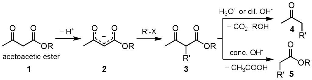 Keywords: Acetoacetic ester synthesis.png Scheme of acetoacetic ester synthesis Source Selfmade Date 22 July 2006 Made with ChemDraw 2006-07-22 own assumed Su-no-G