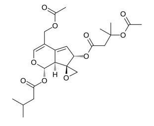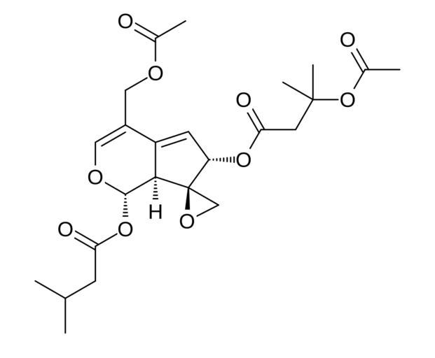 Keywords: Acevaltrate.svg Chemical structure of acevaltrate acetoxyvaltrate acetovaltrate Own 18 04 29 January 2014 UTC Ed Edgar181 Iridoids Acetate esters Isobutyrate esters Epoxides