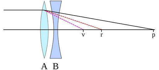 Keywords: Achromatic lens.svg achromatic lens<br> A crown<br> B flint<br> v focus of violet without flint<br> r focus of red without flint<br> p focous of both with flint Achromatische Linse<br> A Kronglas<br> B Flintglas<br> v Fokus des violetten Anteils ohne Flintglas<br> r Fokus des roten Anteils ohne Flintglas<br> p Fokus beider Anteile mit Flintglas Own 2006-09-16 Andreas 06 Lens diagrams |