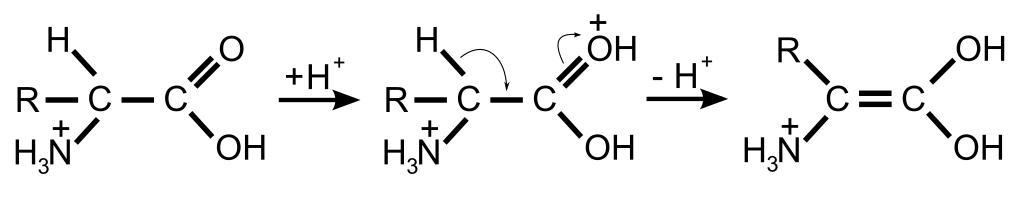 Keywords: Acidic Razemisation 01.svg Racemisation of amino acids under acidic conditions Racemisierung einer Aminosäure unter sauren Bedingungen own made with Inkscape 2012-09-21 Kuebi Armin Kübelbeck Racemic mixture