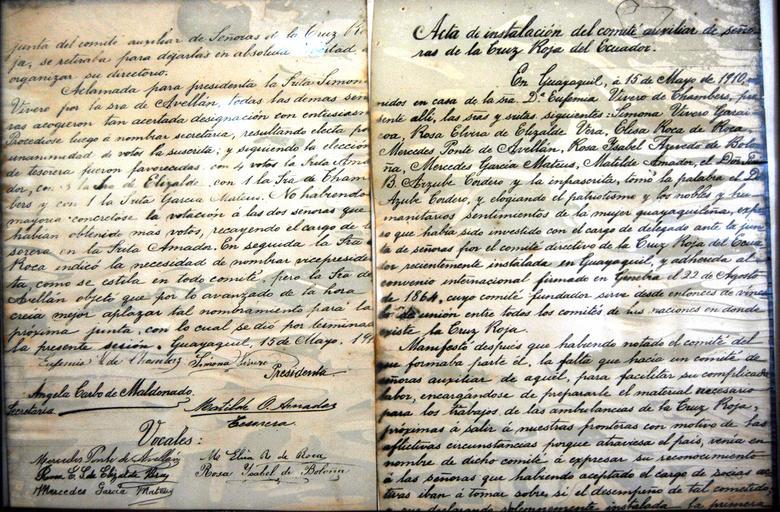 Keywords: Acta damas.jpg es Documento manuscrito de Acta de Constitución del Comité de Damas de la Cruz Roja Ecuatoriana en 1910 conformado en la ciudad de Guayaquil Fotografía tomada al Acta de Constitución del Comité de Damas de la Cruz Roja Ecuatoriana en 1910 Cruz Roja Ecuatoriana facsimil de un original 1910 El documento se encuentra en la Junta Provincial de Guayas Guayaquil de la Cruz Roja Ecuatoriana PD-old 1910 documents 1910 in Ecuador History of Guayaquil History of the Red Cross |