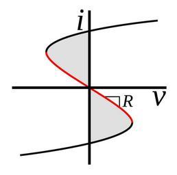 Keywords: Active negative resistance - current controlled.svg Current-voltage IV diagram of a linear negative resistance produced at the port of an amplifier with positive feedback The curve has a straight line segment through the origin with negative slope -R so applying a voltage v to the amplifier causes a proportional current i to flow out of the positive terminal the opposite of an ordinary positive resistance The device has both negative differential resistance grey region and negative static resistance <font color red >red</font> region <br /> <math>R v \over i \Delta v \over \Delta i < 0 \ </math> Applying a large enough current of either polarity to it moves the amplifier into nonlinear regions of the curve saturating the amplifier so the resistance becomes positive black portion of curve This type of negative resistance is found in feedback oscillators negative impedance converters and active filters own Chetvorno 2013-07-22 Negative resistance Device current-voltage characteristics Cc-zero |