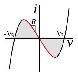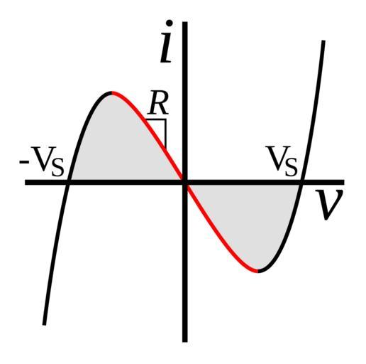 Keywords: Active negative resistance - voltage controlled.svg Current-voltage IV diagram of a active negative resistance produced at the port of an amplifier with positive feedback The curve has a straight line segment through the origin with negative slope -R so applying a voltage v to the amplifier causes a proportional current i to flow out of the positive terminal the opposite of an ordinary positive resistance The device has both negative differential resistance <font color red >red</font> region and is active produces power grey region <br /> <math>R v \over i \Delta v \over \Delta i < 0 \ </math> Applying a large enough voltage of either polarity to it moves the amplifier into nonlinear regions of the curve and if the voltage exceeds the amplifier power supply rails V<sub>s</sub> the amplifier will saturate and the resistance will become positive This type of negative resistance is found in feedback oscillators negative impedance converters and active filters own Chetvorno 2013-07-22 Negative resistance Device current-voltage characteristics Cc-zero |