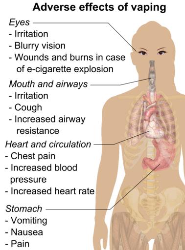 | Keywords: Adverse effects of vaping (raster).png Adverse effects of vaping Entries Eyes Eye irritation<ref name Biyani2015> cite journal Biyani S Derkay CS E-cigarettes Considerations for the otolaryngologist International journal of pediatric otorhinolaryngology 28 April 2015 10 1016/j ijporl 2015 04 032 25998217 </ref> and blurry vision<ref name BrelandSpindle2014> cite journal Breland Alison B Spindle Tory Weaver Michael Eissenberg Thomas Science and Electronic Cigarettes Journal of Addiction Medicine 8 4 2014 223 “233 1932-0620 10 1097/ADM 0000000000000049 4122311 25089952 </ref> Corneoscleral lacerations or ocular burns after e-cigarette explosion<ref name PaleyEchalier2016> cite journal Paley Grace L Echalier Elizabeth Eck Thomas W Hong Augustine R Farooq Asim V Gregory Darren G Lubniewski Anthony J Corneoscleral Laceration and Ocular Burns Caused by Electronic Cigarette Explosions Cornea 35 7 2016 1015 “1018 0277-3740 10 1097/ICO 0000000000000881 4900417 27191672 </ref> Airways Irritation and cough<ref name Grana2014> cite journal Grana R Benowitz N Glantz SA E-cigarettes a scientific review Circulation 13 May 2014 129 19 1972 “86 10 1161/circulationaha 114 007667 24821826 4018182 </ref> Increased airway resistance<ref name EbbertAgunwamba2015> cite journal Ebbert Jon O Agunwamba Amenah A Rutten Lila J Counseling Patients on the Use of Electronic Cigarettes Mayo Clinic Proceedings 90 1 2015 128 “134 00256196 10 1016/j mayocp 2014 11 004 25572196 </ref><ref name Orellana-Barrios2015/> Stomach Nausea and vomiting<ref name Grana2014/><ref name Orellana-Barrios2015> cite journal Orellana-Barrios Menfil A Payne Drew Mulkey Zachary Nugent Kenneth Electronic cigarettes-a narrative review for clinicians The American Journal of Medicine 2015 00029343 10 1016/j amjmed 2015 01 033 25731134 </ref> Abdominal pain<ref name BrelandSpindle2014/> Heart and circulation Chest pain<ref name Orellana-Barrios2015/> Increased blood pressure<ref name Orellana-Barrios2015/> Increased heart rate<ref name Orellana-Barrios2015/> Mortality Death after e-cigarette explosion small risk <ref name PaleyEchalier2016/> References reflist <P>To discuss image please see Template talk Human body diagrams All used images are in public domain Mikael Häggström 2015-07-10 Adverse effects of vaping vector svg Human body diagrams Diagrams of the adult male human body by Mikael Häggström |