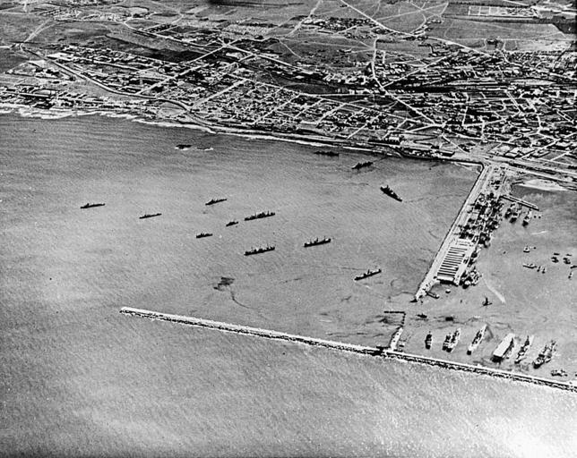 | Keywords: Aerial view of Casablanca harbour on 16 November 1942.jpg Aerial view of Casablanca harbour Morocco and vicinity on 16 November 1942 eight days after the 8 November invasion and naval battle there Among the ships outside the harbor entrance are three U S Navy destroyers a minesweeper and in center the torpedoed cargo ship USS Electra AK-21 with the tug USS Cherokee AT-66 off her bow Closer to shore are three beached French warships from right to left light cruiser Primauguet destroyer Albatros and destroyer Milan Inside the harbor with sterns toward the outer breakwater are eight U S Navy ships They are from left to right two minesweepers USS Terror CM-4 USS Brooklyn CL-40 USS Chenango ACV-28 with a destroyer tied to her starboard side USS Augusta CA-31 and a transport Official U S Navy photo http //www history navy mil/our-collections/photography/numerical-list-of-images/nara-series/80-g/80-G-1000000/80-G-1003967 html 80-G-1003967 from the U S Navy http //www history navy mil Naval History and Heritage Command 1942-11-16 USN PD-USGov-Military-Navy Casablanca in World War II Operation Torch |