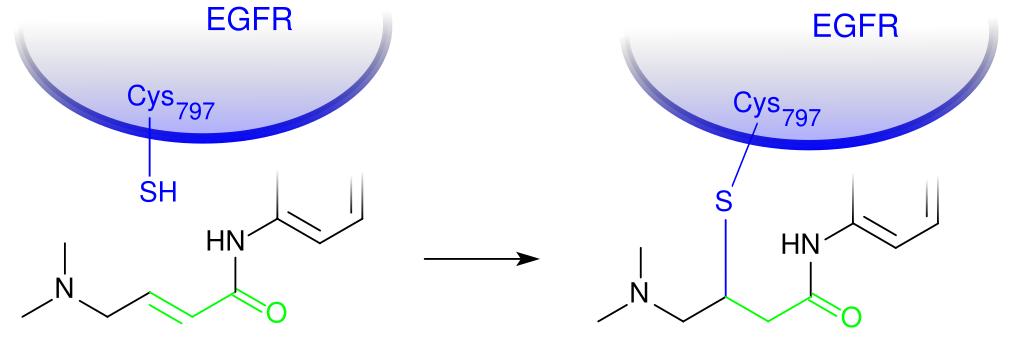 Keywords: Afatinib mechanism.svg afatinib it covalently binds to cysteine 797 of the epidermal growth factor receptor EGFR via a Michael reaction own Anypodetos 2013-03-23 Other fields B + Other versions Afatinib skeletal svg 64 the structure of afatinib Afatinib Reaction mechanisms Cc-zero |