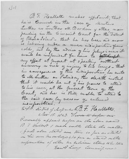 | Keywords: Affidavit of B.F. Hallett in the case of Martin Luther v. Luther Borden, et. al. - NARA - 278281.tif Scope and content This document is from the file for the case of Martin Luther v Luther Borden This is a suit for trespass against a group of Rhode Island state militia who acting under martial law broke into Martin Luther's house in the middle of the night searched the premises and threatened its inhabitants Luther claimed that the legislation establishing martial law was void because the charter government which proclaimed martial law was not the legal government of Rhode Island The defendents claimed that the declaration of martial law was legal and that they were acting under the orders of their superior officers when they entered the house to search for Luther who was an important supporter of Thomas W Dorr who had organized a people's government The decision of the US Circuit Court in favor of the defendents was appealed to the US Supreme Court The US Supreme Court however feeling that the case was political in nature refused to rule on the issues and returned the case to the US Circuit Court This case was an important case in the historic events commonly known as the Dorr Thomas W Dorr Rebellion General notes 278281 Local identifier U S Circuit Court for the District of Rhode Island 1790 - 01/01/1912 NARA's Northeast Region Boston NRAAB 380 Trapelo Road Waltham MA 02452-6399 date 1843 11 15 - 1843 11 15 Record group Record Group 21 Records of District Courts of the United States 1685 - 2004 Record group ARC 350 Case Files compiled 11/1790 - 12/1911 Series ARC 278236 File unit Martin Luther v Luther Borden et al 10/06/1842 - 12/1848 File unit ARC 278271 Variant control numbers NAIL Control Number NRAB-21-CASECCRI-24LAW-J yes Other versions NARA-cooperation PD-USGov Luther v Borden |
