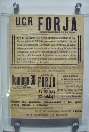 Keywords: Afiche de la FORJA III.JPG es Afiche de la FORJA en el Museo del Bicentenario Own Foto sacada por Gelpgim22 Sergio Panei Pitrau 5 de agosto de 2011 afiche de la década de 1940 cc-zero Museo del Bicentenario Infamous decade