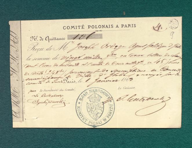 Keywords: AGAD (3) Rachunek Komisji, PudÅ‚o 660-12 s. 9.png žDowody do rachunków Józefa OrdÄ™gi Komisarza w Paryżu i Agenta Politycznego we WÅ‚oszech i Szwajcarii <br /> Komitet Polski w Paryżu kwituje sumy otrzymane od Józefa OrdÄ™gi agenta politycznego we WÅ‚oszech<br /> RzÄ…d Narodowy prowadziÅ‚ dziaÅ‚alność także za granicÄ… gdzie miaÅ‚ wiele swych agend ByÅ‚y to placówki dyplomatyczne - konsulaty polskie urzÄ™dy komisarzy peÅ‚nomocnych i organizatorów wojskowych oraz instytucje do okreÅ›lonych zadaÅ„ TakÄ… instytucjÄ… byÅ‚ Komitet Polski w Paryżu powoÅ‚any dekretem z 3 V 1863 r którego przewodniczÄ…cym zostaÅ‚ ks WÅ‚adysÅ‚aw Czartoryski także główny peÅ‚nomocnik dyplomatyczny RzÄ…du do spraw polityki zagranicznej Sekretarzem Komitetu byÅ‚ Józef OrdÄ™ga Gdy pozycja Komitetu zaczęła sÅ‚abnąć rozwiÄ…zany w maju 1864 r od 5 XI 1863 r jego atrybucje dotyczÄ…ce prasy zostaÅ‚y powierzone Agencji Dyplomatycznej Paryskiej WydziaÅ‚owi Druków natomiast dotyczÄ…ce spraw wojskowych “ agentowi wojskowemu RzÄ…du Narodowego w Paryżu i agentowi broni w Liége Oba stanowiska zajmowaÅ‚ byÅ‚y dyrektor WydziaÅ‚u Wojny RzÄ…du Narodowego “ pÅ‚k Eugeniusz Kaczkowski-DÄ™biÅ„ski PowoÅ‚ano także agencje do zakupu i dostaw broni m in Komisja Broni w Legie z Aleksandrem Guttrym na czele Dekretem RzÄ…du Narodowego z 5 VII 1863 r zostaÅ‚a powoÅ‚ana Komisja DÅ‚ugu Narodowego Krajowego w skÅ‚adzie ks WÅ‚adysÅ‚aw Czartoryski Józef OrdÄ™ga dr Seweryn Gałęzowski w zwiÄ…zku z ogÅ‚oszeniem pożyczki przymusowej w wysokoÅ›ci 21 mln zÅ‚p najpierw u zamożniejszych kapitalistów krajowych zamienionÄ… na ogólnÄ… pożyczkÄ™ narodowÄ… w wysokoÅ›ci 40 mln zÅ‚p i zabezpieczonÄ… na caÅ‚ym majÄ…tku narodowym Komisja zobowiÄ…zana zostaÅ‚a do prowadzenia Wielkiej KsiÄ™gi DÅ‚ugu Narodowego oraz przygotowania wespół WydziaÅ‚em Skarbu RzÄ…du Narodowego obligacji pożyczkowych Na potwierdzenie wpÅ‚ywów pożyczki WydziaÅ‚ Skarbu wydaÅ‚ specjalne kwity tymczasowe Zbieraniem i wydatkowaniem Å›rodków pieniężnych kierowaÅ‚y w okresie powstania nie tylko centralne ale także lokalne wÅ‚adze powstaÅ„cze oraz dowódcy oddziałów Dokumenty skarbowe znajdowaÅ‚y siÄ™ także w innych paÅ„stwach Europy - tam gdzie istniaÅ‚y jakiekolwiek wÅ‚adze czy agentury powstaÅ„cze Komisja DÅ‚ugu Narodowego swym zasiÄ™giem obejmowaÅ‚a kraj i zagranicÄ™ gdzie docieraÅ‚a do zamożniejszych Polaków i prowadziÅ‚a rokowania z finansistami francuskimi o zaciÄ…gniÄ™cie u nich pożyczki w wysokoÅ›ci 30 mln franków Na podstawie rozporzÄ…dzenia WydziaÅ‚u Skarbu RzÄ…du Narodowego z 15 XII 1863 r do kasy Komisji miaÅ‚y być wnoszone także skÅ‚adki i ofiary zebrane za granicÄ… przez Komitet Polski Wszystkie te fundusze byÅ‚y w dyspozycji WydziaÅ‚u Skarbu RzÄ…du Narodowego któremu Komisja podlegaÅ‚a W archiwum Komisji DÅ‚ugu Narodowego stanowiÄ…cej centralnÄ… kasÄ™ zagranicznÄ… powstania znajdowaÅ‚y siÄ™ bogate materiaÅ‚y do stanu skarbu i polityki finansowej wÅ‚adz narodowych tego okresu W poÅ‚owie lipca 1863 r na agenta RzÄ…du Narodowego w Turynie wyznaczony zostaÅ‚ Józef OrdÄ™ga b komisarz RzÄ…du Narodowego w Paryżu sekretarz Komitetu Narodowego Polskiego i czÅ‚onek Komisji DÅ‚ugu Narodowego; od wrzeÅ›nia tego roku peÅ‚niÅ‚ on funkcjÄ™ agenta dyplomatycznego we WÅ‚oszech i Szwajcarii W latach 1863-1864 przez rÄ™ce Józefa OrdÄ™gi przeszÅ‚o ponad 630 tys franków ze skÅ‚adek polskich i zagranicznych; sumy te szÅ‚y w wiÄ™kszej części na cele wojenne w mniejszej na koszty polskiej dyplomacji i propagandy W 1868 r OrdÄ™ga uczestniczyÅ‚ w Paryżu w likwidacji dziaÅ‚alnoÅ›ci Komisji DÅ‚ugu Narodowego <br /> Archiwum Komisji DÅ‚ugu Narodowego wraz z caÅ‚oÅ›ciÄ… zbiorów spÅ‚onęło w czasie powstania warszawskiego w 1944 r Wobec jego zniszczenia wiele podstawowych zagadnieÅ„ pożyczki narodowej nie sposób dokÅ‚adnie wyjaÅ›nić Brak jest np przepisów regulujÄ…cych kwestiÄ™ przerachowania <br /> Opisywany dokument jest kwitem wystawionym przez Komitet Polski w Paryżu znajdujÄ…cym siÄ™ w pliku rachunków i kwitów Józefa OrdÄ™gi Komisarza w Paryżu i Agenta Politycznego we WÅ‚oszech i Szwajcarii W dokumencie tym kasjer S Gałęzowski i sekretarz Ignacy PopÅ‚awski potwierdzajÄ… iż otrzymali od Józefa OrdÄ™gi agenta politycznego na WÅ‚ochy sumÄ™ 20 tys franków w dwóch wekslach z których jeden opiewaÅ‚ na 8 tys franków a drugi na 12 tys PieniÄ…dze te zostaÅ‚y przekazane przez Komitet w Turynie Na kwicie znajduje siÄ™ okrÄ…gÅ‚a pieczęć tuszowa RzÄ…d Narodowy Komitet Polski w Paryżu <br /> Miejsce Paryż<br /> Opis zewnÄ™trzny Rkps na formularzu jÄ™z franc karta papierowa o wym 163x105 mm<br /> Miejsce przechowywania Biblioteka Polska w Paryżu RzÄ…d Narodowy powstania 1863-1864 Archiwum Izby Obrachunkowej w Paryżu sygn 660/12 s 9<br /> Autor komentarza SÅ‚awomir Postek<br /> Autor fotografii PaweÅ‚ PiÅ‚at 1863-01-01 Archiwum Główne Akt Dawnych author PD-old January Uprising documents Media contributed by AGAD presented in former polska pl portal Uploaded with VicuñaUploader January Uprising seals |