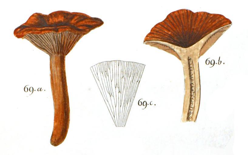 Keywords: Agaricus-cimicarius-Batsch-Tab-15-69.jpg http //www zum de/stueber/batsch/elenchus2/high/IMG_5418 html January 27 2013 ; Abbildungen zu N 69 A cimicarius in the original spelling a Ein vollständiger Schwamm<br/> b Ein zerschnittner Schwamm den welchem die Runzeln am Oberrande der Blättchen und die Löcher und Gruben in der Höhlung des Stiels zu sehen sind<br/> c Die besondern Verwachsungen der Blättchen<br/> ;Translation Figures for Nr 69<br/> A complete a fungus<br/> b A cut-up fungus You can see the wrinkles on the upper edge of the lamellae and the holes and pits in the cave of the stem <br/> c The peculiar intergrowths of lamellae<br/> http //www zum de/stueber/batsch/elenchus2/high/IMG_5531 jpg zum de/stueber 1786 August J G K Batsch PD-old-100 Elenchus Fungorum Lactarius camphoratus |