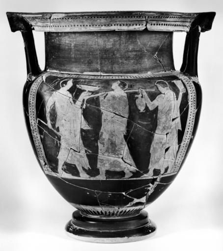 Keywords: Agrigento Painter - Column-Krater with Komos - Walters 4871 - Side B.jpg This red-figure column-krater depicts the komos on both the front and back On the front left is a youth with a chlamys draped around his shoulders and a wreath around his head He stands to the right holding in his left hand a lyre with a sash hanging from it; he leans on a staff held in the right hand In front of him another youth with a chlamys draped in a similar fashion moves left looking around He carries a staff in his left hand diagonally across his chest and with the right he manipulates his genitals Next is a youth who stands to the right playing a barbiton from which a sash hangs He holds the plectron in his right hand; the fingers of his left rest on the strings A chlamys is draped over his left shoulder; he wears a thick fillet In front of him stands a fourth youth who moves to the left an oinochoe in his right hand a kylix in his left A chlamys is draped around his shoulders and he wears a wreath On the back left is a mantled youth with a fillet who moves right a kylix in his raised left hand and a staff in the right held diagonally across his lower body His pursed lips and closed eye suggest that he is engrossed in song In the center another mantled youth moves left He holds a staff in his right hand over his shoulder and tilts his head back as if also in song On the right a third mantled youth moves left He holds up an oinochoe in his right hand and a skyphos in his left ca 470 460 BC Classical terracotta cm 47 6 37 5 h x max diam ; at mouth cm 37 6 diam ; at foot cm 18 9 diam accession number 48 71 6937 Don Marcello Massarenti Collection Rome cat no 192 Henry Walters city Baltimore Walters Art Museum Henry Walters Acquired by Henry Walters with the Massarenti Collection 1902 place of origin Attica Greece Walters Art Museum license Ancient Greek red-figure pottery in the Walters Art Museum Agrigento Painter Chlamydes Column kraters Media contributed by the Walters Art Museum needs artist update Komos scenes |