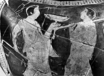 Keywords: Agrigento Painter - Column-Krater with Komos - Walters 4871 - Side B Detail.jpg This red-figure column-krater depicts the komos on both the front and back On the front left is a youth with a chlamys draped around his shoulders and a wreath around his head He stands to the right holding in his left hand a lyre with a sash hanging from it; he leans on a staff held in the right hand In front of him another youth with a chlamys draped in a similar fashion moves left looking around He carries a staff in his left hand diagonally across his chest and with the right he manipulates his genitals Next is a youth who stands to the right playing a barbiton from which a sash hangs He holds the plectron in his right hand; the fingers of his left rest on the strings A chlamys is draped over his left shoulder; he wears a thick fillet In front of him stands a fourth youth who moves to the left an oinochoe in his right hand a kylix in his left A chlamys is draped around his shoulders and he wears a wreath On the back left is a mantled youth with a fillet who moves right a kylix in his raised left hand and a staff in the right held diagonally across his lower body His pursed lips and closed eye suggest that he is engrossed in song In the center another mantled youth moves left He holds a staff in his right hand over his shoulder and tilts his head back as if also in song On the right a third mantled youth moves left He holds up an oinochoe in his right hand and a skyphos in his left ca 470 460 BC Classical terracotta cm 47 6 37 5 h x max diam ; at mouth cm 37 6 diam ; at foot cm 18 9 diam accession number 48 71 6937 Don Marcello Massarenti Collection Rome cat no 192 Henry Walters city Baltimore Walters Art Museum Henry Walters Acquired by Henry Walters with the Massarenti Collection 1902 place of origin Attica Greece Walters Art Museum license Ancient Greek red-figure pottery in the Walters Art Museum Agrigento Painter Column kraters Chlamydes Media contributed by the Walters Art Museum needs artist update Komos scenes |