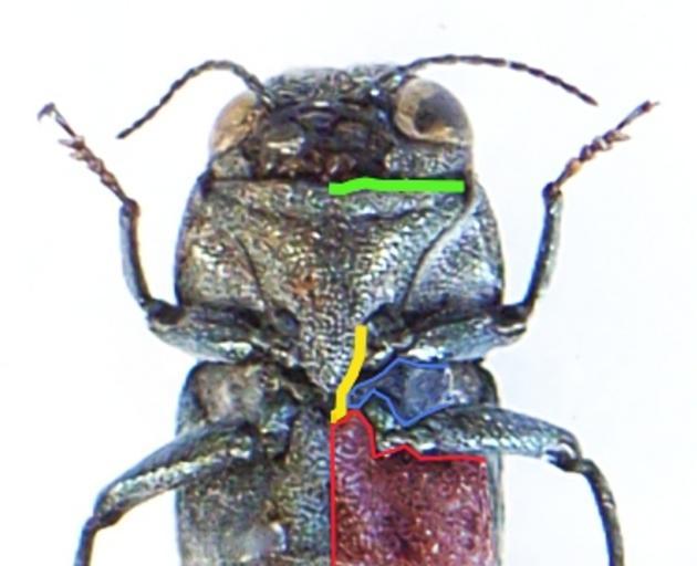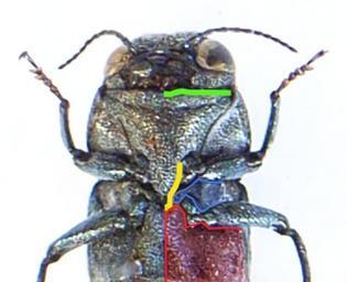 Keywords: Agrilus ater detail.JPG Detail of underside of Agrilus ater<br>rechts eingefärbt<br>grün Vorderende des Kinnfortsatzes der Vorderbrust<br>ocker Prosternalfortsatz <br> blau Mittelbrust <br>rot Hinterbrust Photo made by myself 2007-10-14 Siga public domain Agrilus ater Underside of Coleoptera thorax