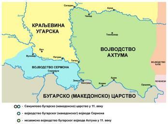 | Keywords: Ahtum sermon02-sr.png English Duchies of Ahtum and Sermon in the 11th century - Serbian language version Serbian војводства Ахтума и Се мона у 11 веку - ве зија на с пском језику 2009-07-25 own assumed PANONIAN References Milan Tutorov Banatska rapsodija - istorika Zrenjanina i Banata Novi Sad 2001 Peter Rokai - Zoltan Đere - Tibor Pal - Aleksandar Kasaš Istorija Mađara Beograd 2002 Prof dr Radmilo Petrović Vojvodina - petnaest milenijuma kulturne istorije Beograd 2003 Jovan Pejin Velikomađarski kapric Zrenjanin 2007 Dušan Belča Mala istorija Vršca Vršac 1997 Ljubica Budać Begej Sveti Đurađ - Žitište Žitište 2000 Veljko Milković Petrovaradin i Srem - misterija prošlosti Novi Sad 2003 Monografija Starih Ledinaca Novi Sad 1998 The Times History of Europe Times Books London 2002 Dragan Brujić Vodič kroz svet Vizantije Beograd 2004 Istorijski atlas Zavod za udžbenike i nastavna sredstva - Zavod za kartografiju Geokarta Beograd 1999 Školski istorijski atlas Zavod za izdavanje udžbenika Socijalističke Republike Srbije Beograd 1970 Source and licence historic map self made by user PANONIAN Voivodeship of Ahtum Voivodeship of Sermon Maps of the history of Romania in the Middle Ages Maps of the history of Serbia in the 11th century Maps of the history of Vojvodina Maps of the history of Banat Maps of the history of Syrmia Maps of the history of Bulgaria in the Middle Ages Maps of the history of the Republic of Macedonia in the Middle Ages Maps in Serbian |