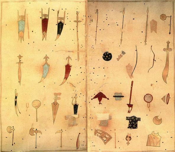Keywords: Ain-i Akbari Weaponry.jpg ru О ужие из Айн-и-Акба и en Weapons of India <br> 1 row jamdhar sehlicaneh 3-pointed dagger jamdhar doulicaneh 2-pointed dagger jamdhar broad dagger baneh sword javelin tschehouta spear barchah lance flail <br>2 row katarah katarsh dagger jhanbwah jambiyah dagger khapwah k'hapwah dagger dhal shield tarkash quiver maktah bow kaman bow scymitar <br>3 row gupti kard dagger shushbur shashpar mace narsingmot'h dagger bank dagger g'hug'hwah chainmail udanah bhelhetah sword phari cane shield sipar shield <br>below angirk'hah over armour coat zirih coat of mail kant'hah sobha neck protection <br>4 row tarangalah axe tabar-zaghnol axe with hammer zaghnol warhammer chaqu clasp knife gardani horse protection qashqah champron bhanju coat with neck protection 1621 Ain-i Akbari К осов Т адиционное о ужие Индии Abu'l-Fazl PD-Old-100 Indo-Persian weapons Military equipment of the Mughal Empire Uploaded with UploadWizard Akbarnama gupti |