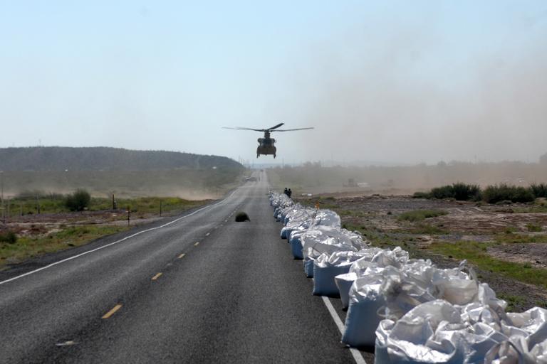 Keywords: Air Cav. Bde. Chinooks fight off flood DVIDS118247.jpg en A CH-47F Chinook helicopter from the Company B Black Cats 2nd Battalion 227th Aviation Regiment 1st Air Cavalry Brigade 1st Cavalry Division approaches a road in Presidio Texas to pick up sand bags Sept 22 2008 The Black Cats are currently supporting flood relief efforts for the town of Presidio by dropping the oversized sandbags on a levee to keep the high waters of the Rio Grande River from flooding the city 2008-09-22 https //www dvidshub net/image/118247 118247 2008-09-26 08 22 US PD-USGov CH-47 Chinook 1st Cavalry Division United States Images from DoD uploaded by Fæ |