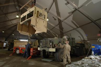 Keywords: Air Force Add-on Armor DVIDS17758.jpg en Balad Air Base Iraq AFPN - Airman 1st Class Roger Hild guides as Staff Sgt Kenneth Pease operates the crane as the upper portion of an Add on Armor AOA cab for a truck tractor is lowered onto the lower armor plated cab section that has already been prepared with floor and firewall plating The add-on-armor kit is a permanent modification This will include new air ride seats and air conditioning since the combat convoys make few if any stops and protective windows are kept shut in the 100+ degrees in the summer The armor provides the driver and gunner added protection against weapons fire and IED explosions Sgt Pease and Amn Hild are deployed to the 732 Expeditionary Logistics Squadron Balad Air Base Iraq The unit is comprised of active duty and reserve component vehicle maintenance technicians who support the Army Field Support Battalion- Iraq The installation of the Level II Add on Armor AOA kits provides a high degree of protection to the troops operating outside the wire Survivors of improvised explosive device explosions often e-mail the unit to give their thanks for them doing such a great armor installation job This the final phase of the AF mission will end with the turnover to contractors in late January 2006 To date the Air Force AoA mission has fielded more than 1 300 Pease and Hild are assigned to the 52nd Logistics Readiness Squadron Spangdahlem Air Base Germany Pease is a native of California City Ca and Hild is from Schertz Tex U S Air Force Photo by Master Sgt Lance Cheung 2006-01-13 Lance Cheung https //www dvidshub net/image/17758 17758 2006-04-03 14 46 BALAD IQ PD-USGov Images from DoD uploaded by Fæ 52d Fighter Wing United States Air Force 332d Air Expeditionary Wing United States Air Force |