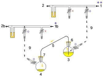 | Keywords: Air sensitive cannula - two manifold system.png Air sensitive cannula - two manifold system 1 Pressure in gas in 1b Pressure in gas in ; second manifold where the pressure in 1>1b 2 Pressure out oil bubbler orange 2b Pressure out oil bubbler orange ; second manifold 3 Higher flask with transfer liquid yellow to transfer 4 Lower receiving flask/transfered liquid yellow 5 Liquid transfer cannula 6 Septum orange on transfer flask 7 Septum orange on receiving flask 8 Pressure-control regulator/stopcock 9 Tubing/ gas-line not shown for clarity arrows show connectivity <font color blue>O</font> Open stopcock; <font color red>X</font> Closed stopcock; black-arrow Gas flow direction orange arrow Liquid flow direction <br> Note As the pressure is higher in the top-shown manifold the pressure will be higher in flask 3 containing the fluid to be transferred Own Quantockgoblin chemistry Cannula transfer Manifolds |