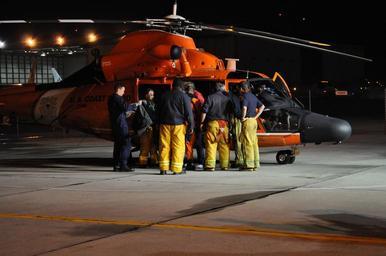 Keywords: Air Station Los Angeles helicopter rescue crewmembers DVIDS1112314.jpg en LOS ANGELES - Coast Guard Air Station Los Angeles rescue crewmembers and emergency medical personnel help four boaters rescued from their sunken boat at around 9 30 p m Dec 6 2011 The boaters were in a 16-foot recreational boat approximately 13 miles north east of Catalina Island when they hailed the Coast Guard over an emergency radio channel Watchstanders at Sector Los Angeles/Long Beach used the Rescue 21 communication system to pinpoint the location of the boaters The boaters activated an electronic positioning indicating radio beacon EPIRB which allowed watchstanders direct a rescue helicopter crew to their position All boaters were safely recovered U S Coast Guard photograph courtesy of Coast Guard Air Station Los Angeles 2010-12-05 https //www dvidshub net/image/1112314 1112314 2013-12-12 16 52 LOS ANGELES CA US PD-USGov CGAS Los Angeles Eurocopter HH-65/MH-65 Dolphin Images from DoD uploaded by Fæ |