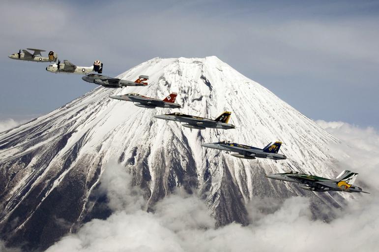 Keywords: Aircraft assigned Carrier Air Wing Five CVW-5 perform formation flight Mount Fuji Japan aircraft