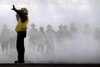 Keywords: aircraft carrier director catapult jets usa navy military directing take off fly mission crew guide