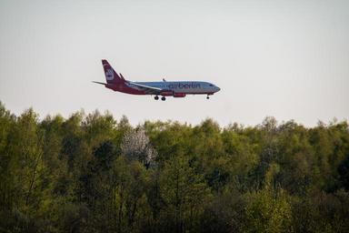 Keywords: aircraft fly land landing sky flyer wing flight blue turbine aviation passenger aircraft red air berlin go away holiday machine airliner travel tourism air traffic forest