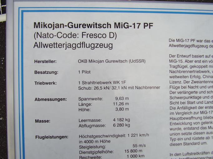 Keywords: Airforce Museum Berlin-Gatow 113.JPG Luftwaffenmuseum der Bundeswehr; Airforce Museum of the Bundeswehr; Berlin-Gatow Own 2007-08 RosarioVanTulpe Von diesem Bild existieren die folgenden Bildbearbeitungen aus der Bilderwerkstatt Retouched versions of this picture from the german Graphic Lab Image Airforce Museum Berlin-Gatow JPG Mikoyan-Gurevich MiG-17 at the Luftwaffenmuseum Berlin-Gatow |