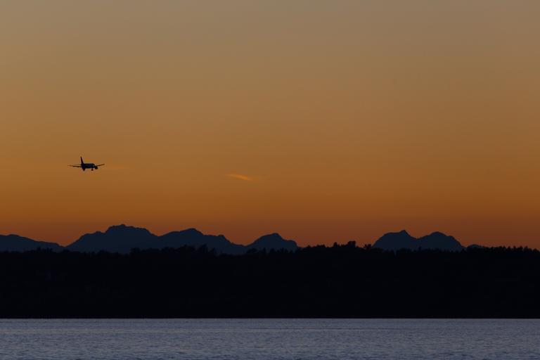 Keywords: airplane evening sunset ocean water flight journey aviation sky plane air travel aircraft transportation twilight dusk silhouettes mountain range