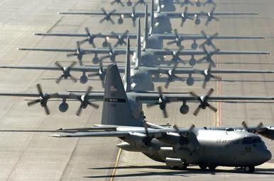 Keywords: airplanes line runway military planes transport turboprops propellers aviation flight c-130 elephant walk wait takeoff hercules