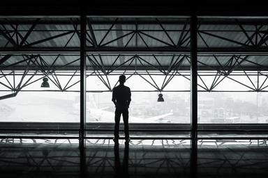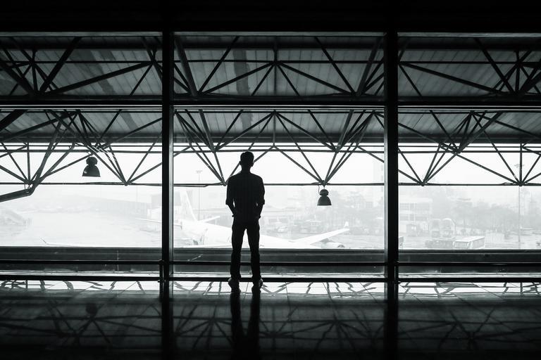 Keywords: airport passenger waiting man standing viewing platform window modern architecture interior airplanes hanger terminal beams lights shadow black and white