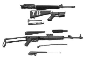 | Keywords: AK-47 and M16 DM-SN-82-07699.JPEG AKMS and M16 ;Date 1 Jan 1980 ;Source http //www dodmedia osd mil/ ;Source's ID DMSN8207699 ;Original caption A United States M-16A1 RIFLE top is compared to a Soviet Union AKM RIFLE The two RIFLEs are disassembled into groups ;Photographer SGT BOBBY BETHUNE PD-USGov derivative works AK-Bolt-Carrier-Bolt-and-Gas piston jpg AKM M16 rifle Field strip Rifles on white background | ||||