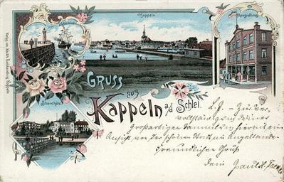 Keywords: AK Kappeln an der Schlei.jpg Ansichtskarte Gruss aus Kappeln a d Schlei 1897 gelaufen; mit Schleimünde Strandhotel Schauspielhaus http //www ebay de before 1897 anonymous PD-old-70-1923 Images from eBay Kappeln Theaters in Schleswig-Holstein Kappeln |