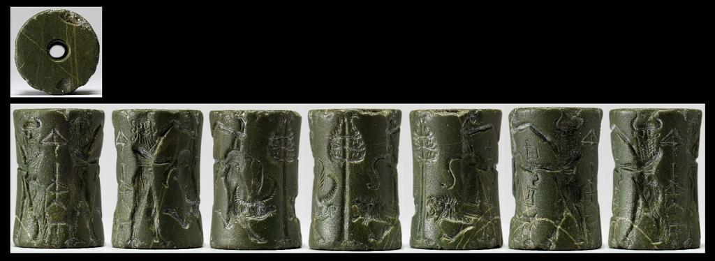 Keywords: Akkadian - Cylinder Seal with King or God and Vanquished Lion - Walters 42674 - View A.jpg The scene on this seal features a central motif of a tree On one side a bearded hero is holding an inverted bovid; on the other a bull man is holding an inverted lion There are cuneiform inscriptions running through the scene in two places La escena en este sello muestra un adorno central de un árbol Por un lado un héroe barbudo esta sujetando un bóvido invertido por el otro lado un hombre toro esta sujetando un león invertido Hay inscripciones cuneiformes a lo largo de la escena en dos áreas date Old Akkadian green stone Diam cm 2 1 accession number 42 674 4594 Sadie Jones Mrs Henry Walters New York date and mode of acquisition unknown Sale Joseph Brummer New York 1941 Walters Art Museum 1941 by purchase Museum purchase 1941 Inscription place of origin Mesopotamia Walters Art Museum license Akkadian cylinder seals Cylinder seals in the Walters Art Museum Epic of Gilgamesh Gilgamesh Bulls in art Bull of Heaven Lions in art of the ancient Near East Animals in art of the ancient Near East Trees in art of the ancient Near East Walters cylinder seal 42674 Cuneiform on cylinder seals Cuneiform on media Walters Art Museum cylinder seals with cuneiform Media contributed by the Walters Art Museum needs category review |