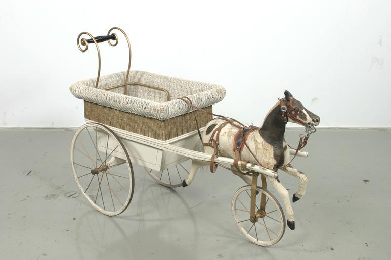 Keywords: Åkvagn m häst, snett framifrån - Livrustkammaren - 13909.tif Liten vagn bestående av vagnskorg och en förspänd häst med seldon i miniatyr Vagnskorgen är försedd med handtag och kan dras som en barnvagn Den lille prinsen eller prinsessan kunde sitta i vagnen och samtidigt hålla i tömmarna Ekipaget rullar på tre hjul <br/><br/>Vagnskorg målad i vitt och guld bestående av två delar Den nedre delen är en trälåda där de vita fälten ramas in av målade guldlinjer På detta är fastsatt en överdel av korg med en målad 110 mm hög guldbård Kanterna på korgen är upptill omvikta och vitmålade Hela vagnskorgen är vitmålad inuti I trälådans sarg är fastskruvat en ställning av metall målad med guldfärg Över vagnskorgens bakre del sträcker sig två 250 mm höga stänger som bildar två voluter mellan vilka ett mörkt balusterformat trähandtag är fastskruvat Två 180 mm långa vita lister är fastsatta längs med vagnskorgens långsidor ca 20 mm ner från sargkanten Troligtvis har de använts som stöd för en nu försvunnen bänk där barnet har kunnat sitta Vagnskorgen är försedd med två stora hjul diam 510 mm med guldmålade ekrar och hjulskenor <br/><br/>Från vagnskorgen löper skaklar fram till hästen - en vit skäck med bruna fläckar och ögon av glas Hästens stomme består av trä Till denna har skarvats ihop delar av päls och skinn som sedan sytts ihop Svanens är gjord av grått tagel Manen består numera endast av några få strån Seldonen är i form av huvudlag och s k bröstsele bestående av däckel med tre tömlöpare ryggstycke svansrem och hintertyg brösta saknas Tömmarna löper genom de två yttersta tömlöparna fram till huvudlaget Till huvudlaget hör nackrem pannrem käkrem sidorem och körstång Hästen har skygglappar framför ögonen <br/>Både bröstsele och huvudlag är av brunt läder medmetalldetaljer <br/><br/>Hästen bärs upp av två tunna metallskenor mellan skaklarna Under hästens mage finns även en grövre guldmålad metallställning som förbinder hästen och skaklarna med det hjul som bär upp vagnens främre del Hjulet är av samma modell som föregående men något mindre 310 mm i diam original caption åkvagn m häst snett framifrån ca 1906 size mm 510 hjul bak size mm 310 hjul fram size mm 800 size mm 340 korg ö marken size mm 400 vagnskorg size mm 800 mellan hjulnav size mm 600 största size mm 930 största size mm 1450 g 19000 LRK Hästen 1977 Prinsessor place of origin original filename lm_dig0638 52187 inventory number LRK 15620 13909 CC-BY-SA Samuel Uhrdin <gallery caption Different images of same object > File Åkvagn m häst höger sida - Livrustkammaren - 22472 tif File Åkvagn m häst vänster sida - Livrustkammaren - 31034 tif </gallery> Samuel Uhrdin Horse equipment Media contributed by LSH dim-with multiple size templates Color images from Livrustkammaren Media contributed by LSH 2013-10 |