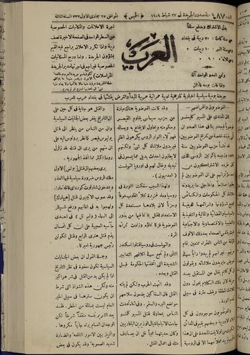 | Keywords: Al-Arab, Volume 3, Number 487, February 27, 1919 WDL12725.jpg Artwork ru Анистас а и аль-Ка мили 1866 1947 fr Anistās Mārī al-Karmilī ab 1866-1947 en Anistās Mārī al-Karmilī ab 1866-1947 zh 阿尼斯塔斯·玛里·卡尔密里,1866-1947 年 pt Anistās Mārī al-Karmilī ab 1866 a 1947 ar أنستاس ماري، الكرملي، الأب، 1866-1947 es Anistās Mārī al-Karmilī ab 1866-1947 ru Аль-А аб том 3 487 27 фев аля 1919 года fr Al-Arab volume 3 n° 487 27 février 1919 en Al-Arab Volume 3 Number 487 February 27 1919 zh 阿拉伯人报 ,第 3 卷,第 487 ,1919 年 2 27 日 pt Al-Arab Volume 3 Número 487 27 de fevereiro de 1919 ar العرب، المجلد الثالث، العدد 487، 27 فبراير 1919 ru Газета <em> Аль-А аб </em> А абы впе вые вышла в Багдаде 4 июля 1917 года спустя п име но четы е месяца после того как б итанские войска отвоевали го од у ту ок тем самым освободив его от т ехвекового господства Османской импе ии Газета появилась в пе еломный пе иод в исто ии И ака Она выпускалась б итанскими властями и служила упо ом б итанской админист ации на фоне поднимающейся волны и акского и а абского национализма В ней османские ту ки п едставлялись иноземцами а б итанцы освободителями и п едп инимались попытки асши ить влияние б итанской военной и политической ст атегии нап авленной п отив Османской импе ии в Пе вой ми овой войне И название и печатаемые на пе вой ст анице выходные данные в кото ых газета называлась а абской по своей сути и целям уч ежденной в Багдаде а абами и для а абов и публикуемые в газете мате иал все в газете было нап авлено на фо ми ование об аза местного издания отстаивающего инте есы а абского населения В пе едовице пе вого номе а ту ки были названы сыновьями Гога и агога желающими ист ебить а абов этот доб ый на од кото ый в п ошлом внес неоценимый вклад в дело п иумножения знания и п ог есса ми ного сосуществования и гуманизма ате иалы издания были посвящены таким темам как политика новости исто ия и лите ату а Редакто ом газеты был ученый и богослов Анистас аль-Ка мили и акский х истианин ливанского п оисхождения Поначалу газета Аль-А аб выходила каждые два дня но начиная с 28-го номе а стала публиковаться ежедневно к оме воск есенья Вначале она состояла из двух ст аниц пе иодически дополнявшихся п иложениями но начиная с 1 янва я 1918 года стала печататься на четы ех ст аницах В мае 1920 года она пе естала издаваться и ее заменила газета Аль-И ак И ак пе вый номе кото ой увидел свет 1 июня 1920 года <br>Экономические условия; Лите ату а; Политика и уп авление fr Le journal <em>Al-Arab</em> parut pour la première fois à Bagdad le 4 juillet 1917 quatre mois environ après la prise de la ville jusque-là sous la domination des Turcs par les troupes britanniques mettant fin à trois siècles d'emprise ottomane Le journal créé à une période critique de l'histoire de l'Irak était publié par les autorités britanniques et leur servait de porte-parole alors que le nationalisme irakien et arabe était en pleine ascension Dépeignant les Ottomans comme des étrangers et les Britanniques comme des libérateurs le journal avait pour objectif de développer la stratégie politique et militaire britannique contre les Ottomans pendant la Première Guerre mondiale Le titre l'ours qui déclarait que le journal fut « établi avec des principes et des objectifs arabes à Bagdad par des Arabes pour les Arabes » et le contenu visaient à souligner son caractère local et son allégeance arabe Un éditorial paru dans le premier numéro décrit les Turcs comme des « fils de Gog et Magog cherchant à annihiler les Arabes ce grand peuple qui œuvra autrefois de façon mémorable en faveur du savoir du progrès de la cohabitation et de l'humanité » Le journal abordait des sujets tels que la politique l'actualité l'histoire et la littérature Irakien chrétien d'origine libanaise le théologien et érudit Anistās al-Karmilī en était l'éditeur <em>Al-Arab</em> paraissait initialement tous les deux jours puis à partir du numéro 28 il fut publié tous les jours sauf le dimanche Le quotidien comportait d'abord 2 pages et parfois des suppléments mais il passa à 4 pages le 1<sup>er</sup> janvier 1918 Il cessa d'exister en mai 1920 Il fut remplacé par le journal <em>Al-Irak</em> dont le premier numéro parut le 1<sup>er</sup> juin 1920 <br>Conjoncture économique; Littérature; Politique et gouvernement en The newspaper<em> Al-Arab</em> The Arabs was first published in Ba